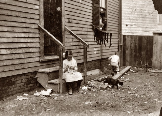 “Another picture of little Annie Fedele, 22 Horace Street, Somerville, Massachusetts, doing piecework, which usually entailed putting the finishing touches (buttons, or collar and waistband trim) on a mostly completed article of clothing. The garment manufacturers paid a few cents for each piece that was done.”