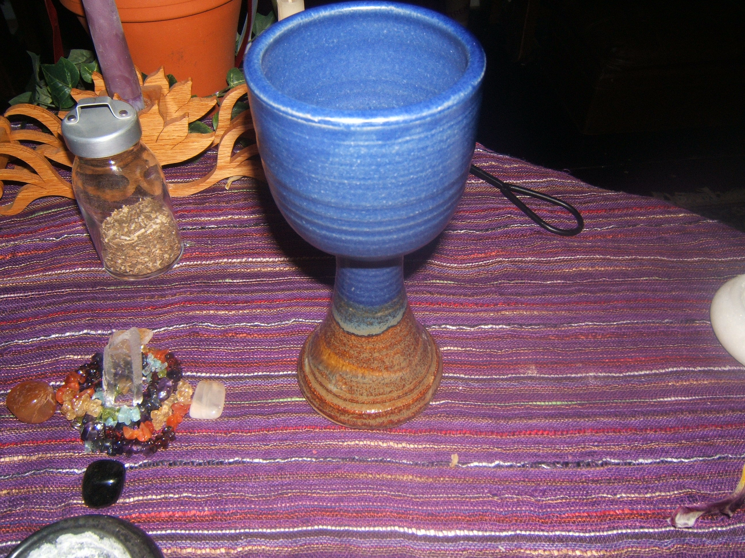 Today two items I had been looking forward to receiving arrived in the mail. A Chalice and Paten, from Pottery Rowe . I can’t recall the name of the design.. twilight perhaps? The Chalice is much larger than I had imagined and will fit a nice big helping of mead or wine.