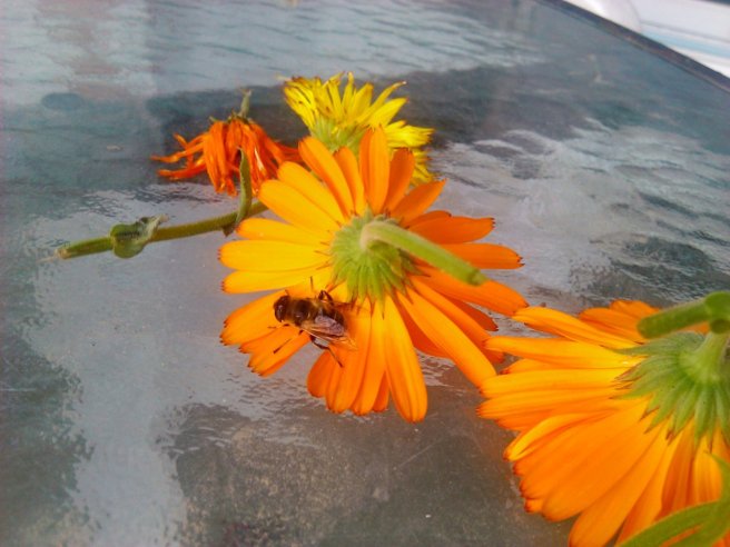 I was picking some of my last few calendula, and after I placed them on the table I realized there was a bee, cold, unmoving but still alive, on the underside of the petals.